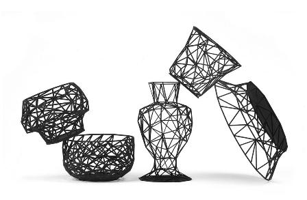 La collezione di vasi e ciotole nere di The M Family prodotti in 3D printing riprendono le sagome classiche delle porcellane traducendole in rappresentazioni grafiche wireframe.