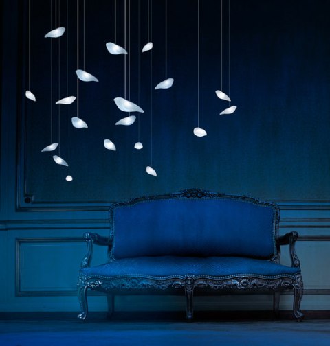 Nella foto sopra, Smoon Birdie Light di Beau&Bien. La sospensione è uno stormo di uccellini in volo, l’illuminazione è a Led e ogni uccellino è fatto di vetro fuso.
