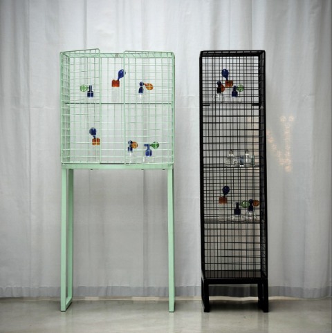 Nel caso della collezione Les Voliéres di Cristina Celestino gli elementi contrastanti sono i fili di metallo che creano la struttura a gabbia e il vetro color seppia delle mensole.