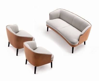 Roberto Lazzeroni crea per Poltrona Frau la minicollezione Nivola formata da una poltrona e un divano dalle linee semplici e arrotondate. La struttura è in legno massello di frassino tinto wengè, il rivestimento esterno è in Cuoio Saddle Extra e l’interno in Pelle Frau o velluto.